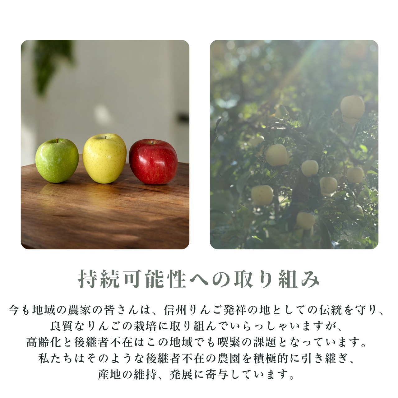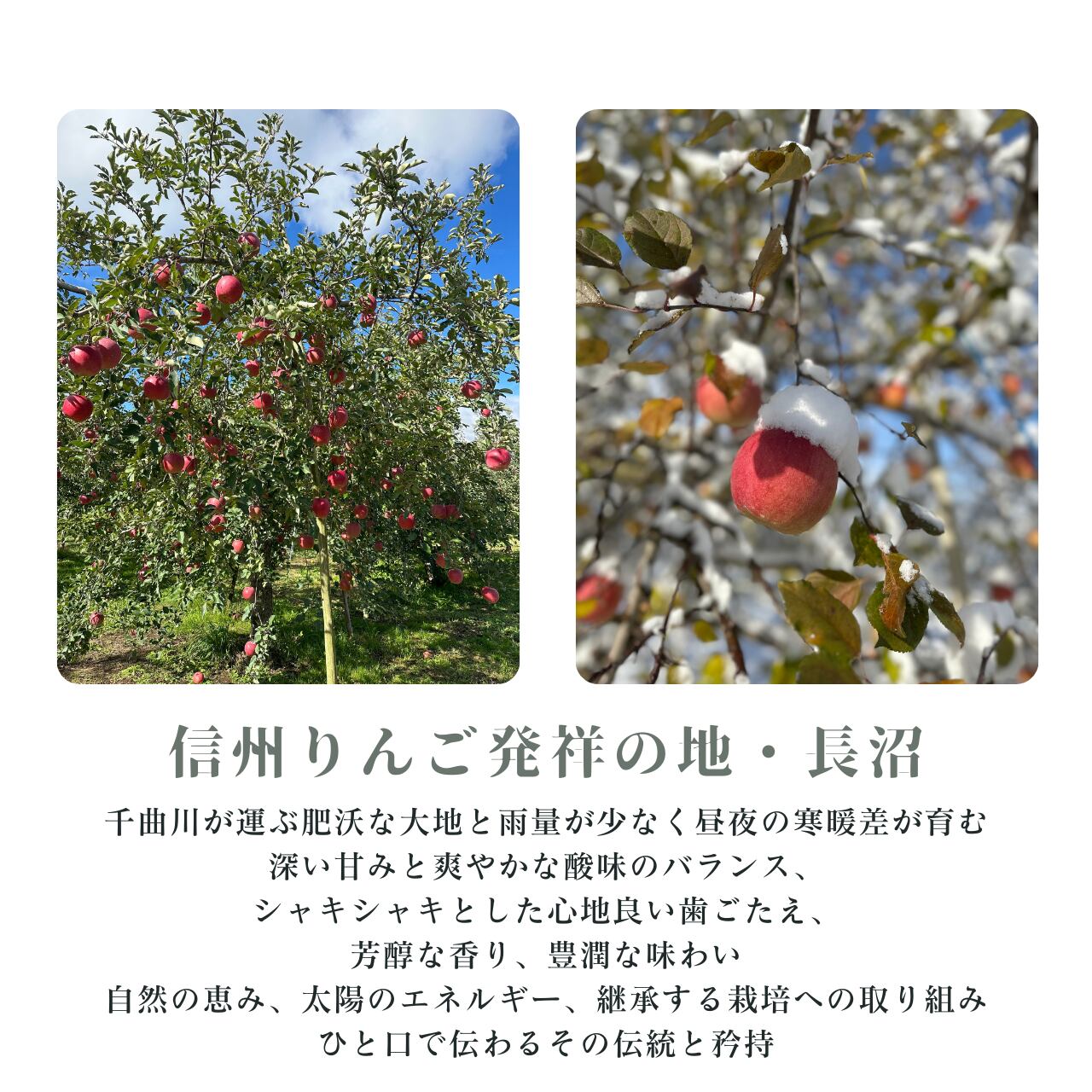 昼夜の寒暖差が大きく雨量が少ない果樹栽培に適した長野市長沼地区のりんごはシャキッとした歯ごたえで甘味と酸味のバランスが良く美味しく仕上がります。