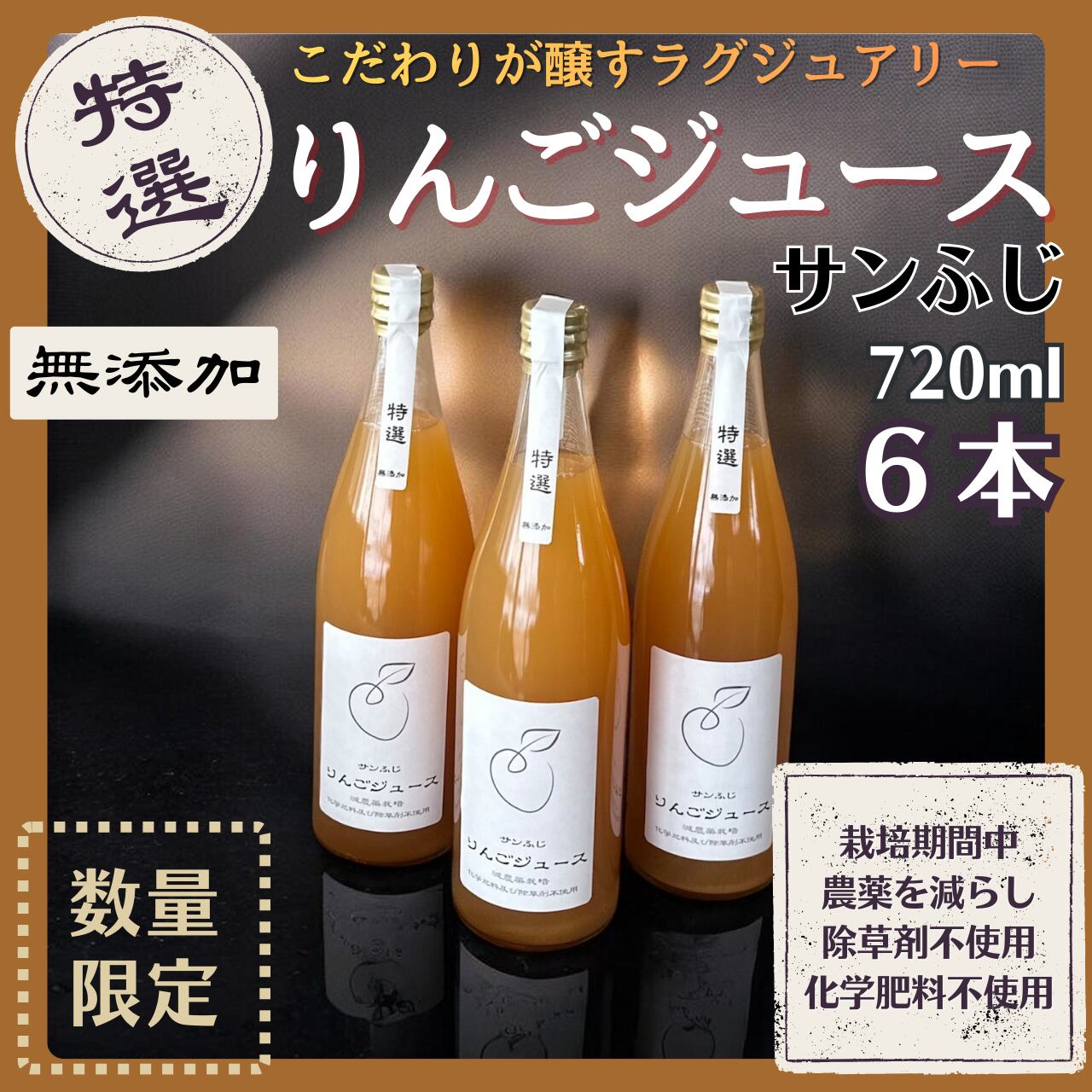 無添加 りんごジュース 特選 サンふじ 化学肥料不使用 除草剤不使用 減農薬栽培 720ml 6本